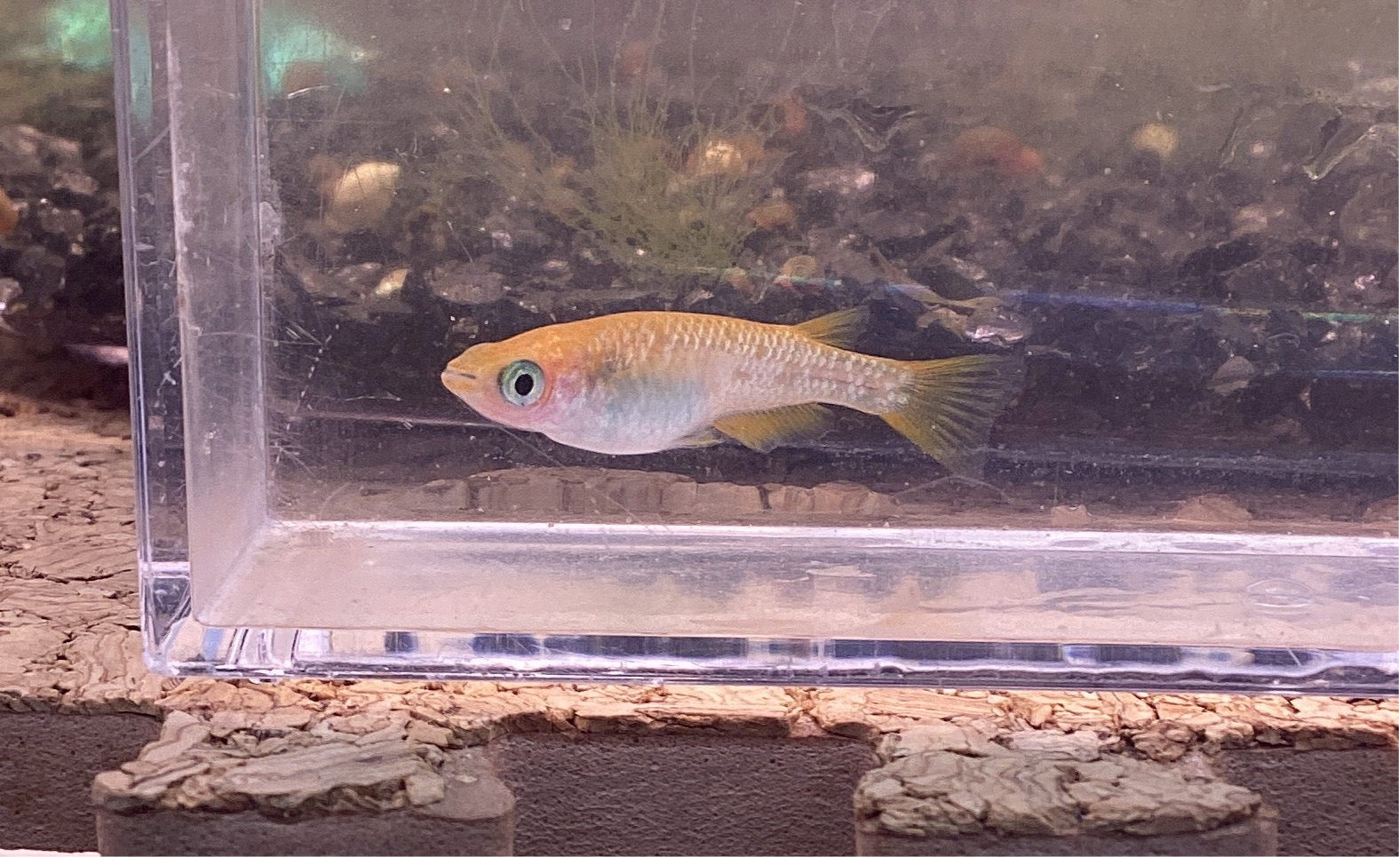 月神と月の響きの掛け合わせと、レクリスの掛け合わせで、レクリスのゴールド体色を保ち、更に薄い黄緑の被膜のようなグアニン層多色ラメとなる品種です🧡